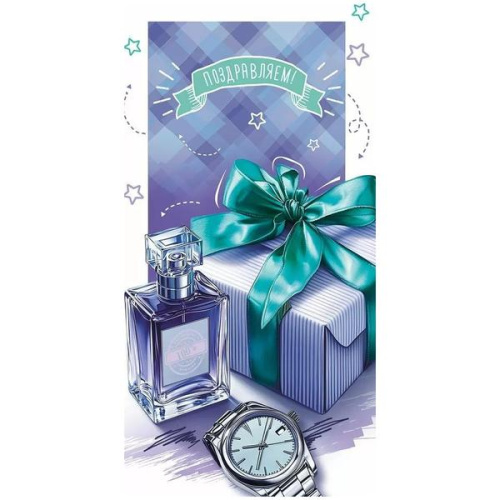 Конверт для денег Поздравляем! Парфюм, часы, подарок, голографические блестки в лаке, текст 425-5,0001963