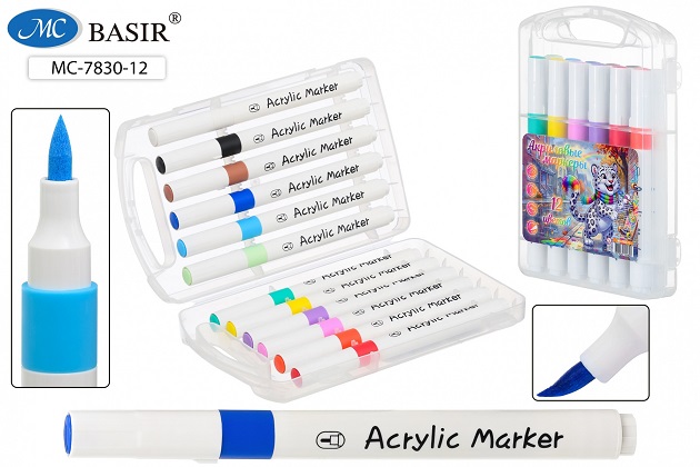 Маркер акриловый 12цв.в наборе "ИРБИС": с мягкой кистью; на водной основе, толщина линии 1-5 mm,пластмассовый бокс МС-7830-12